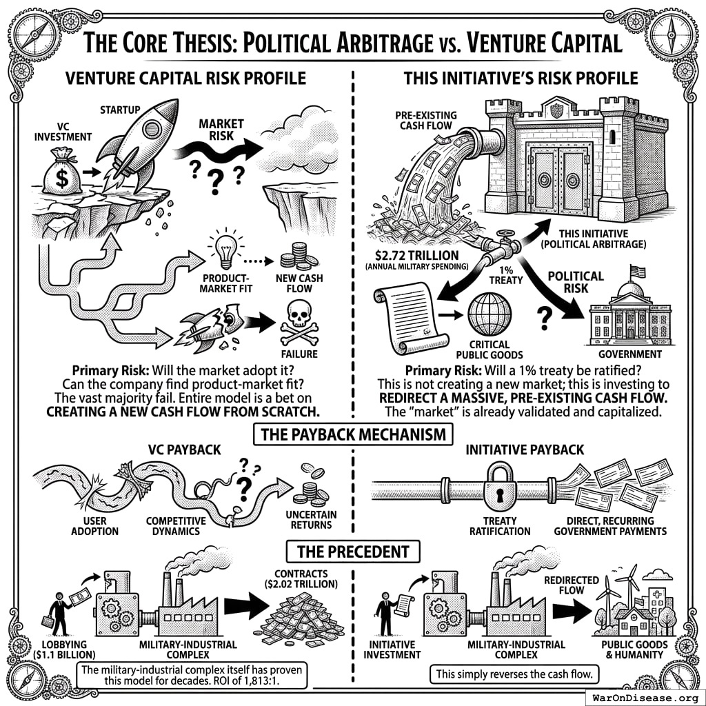 Your risk: Will your 1% Treaty141 get ratified? That’s it. You’re not creating a new market. You’re redirecting a pre-existing cash flow ($2.72 trillion in annual military spending69). The “market” already exists. It’s fully capitalized. Your species is already spending the money. You’re just changing what it buys.