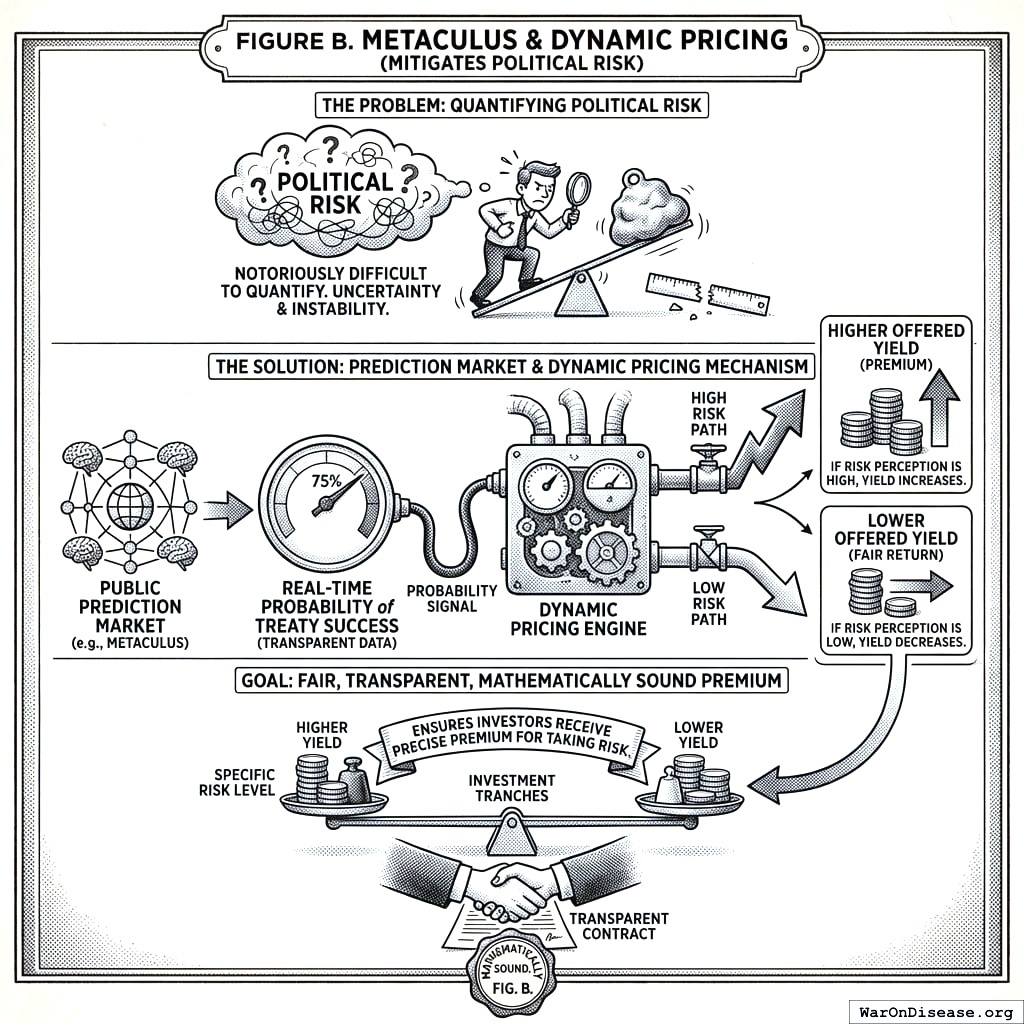 Solution: Use a public prediction market (like Metaculus) to track the probability of treaty success in real time. This prices your bond yields on the fly. High perceived risk? Higher yield. Low risk? Lower yield. Your investors always get a fair premium for the political risk they’re taking. No guessing. Just math.