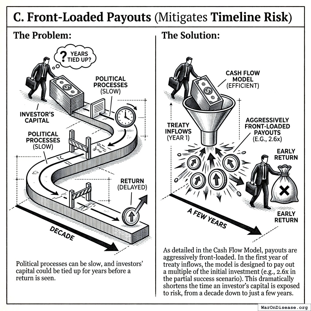 Solution: Payouts are front-loaded. In the first year of treaty inflows, the model pays out a multiple of the initial investment (e.g., 2.6x in the partial success scenario). This shortens risk exposure from a decade to a few years. See the Cash Flow Model for details.