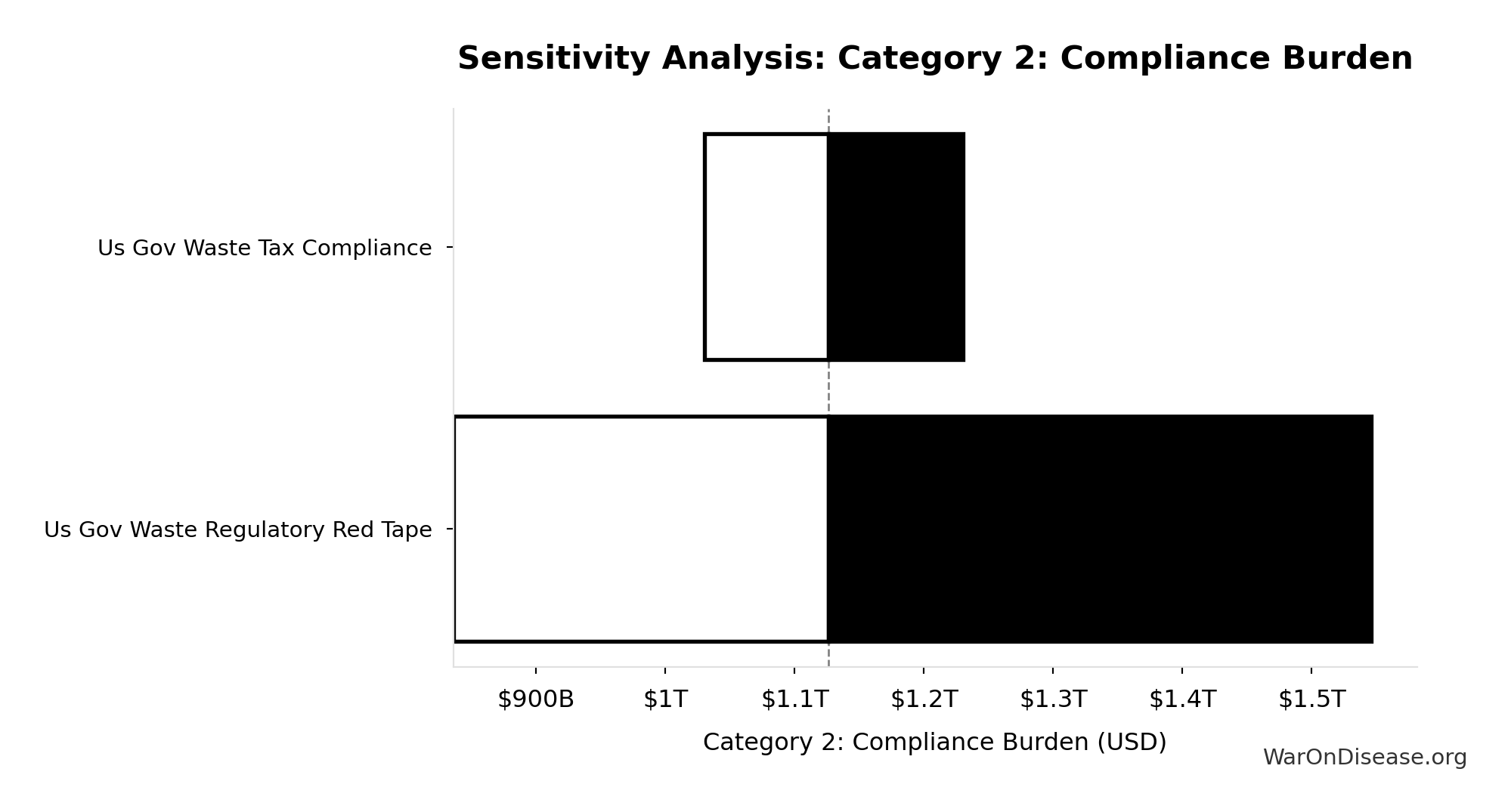 Category 2: Compliance Burden on Private Sector. Private sector resources consumed by government-imposed compliance requirements. Includes tax compliance ($546B) and regulatory red tape ($580B). Total: ~$1.13T annually. Solution: Simplification (tax code reform, regulatory streamlining).