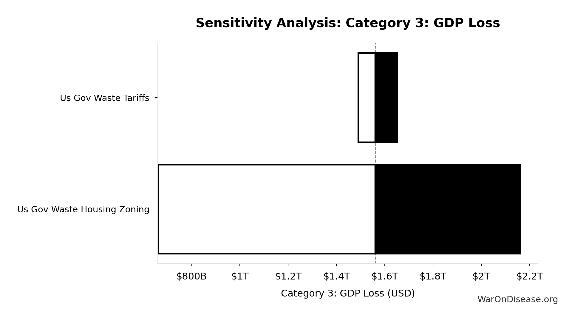 Category 3: Policy-Induced GDP Loss. Economic output foregone due to policy constraints on markets. Includes housing/zoning restrictions ($1.4T) and tariffs ($160B). Total: ~$1.56T annually. Solution: Policy reform (zoning liberalization, trade policy).