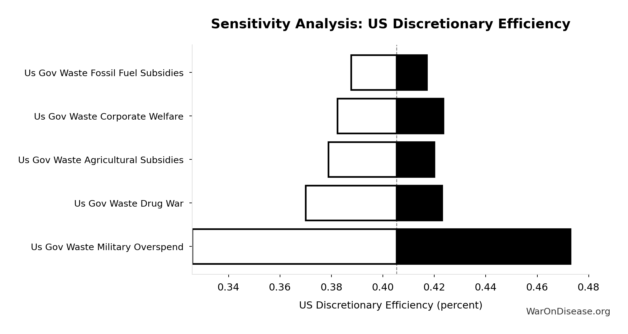 US federal discretionary spending efficiency. What fraction of discretionary spending avoids direct waste (Cat 1 only: military overspend, corporate welfare, drug war, fossil/ag subsidies). ~41%. Some Cat 1 items (farm subsidies, tax expenditures) are technically mandatory/off-budget but are fungible policy choices.