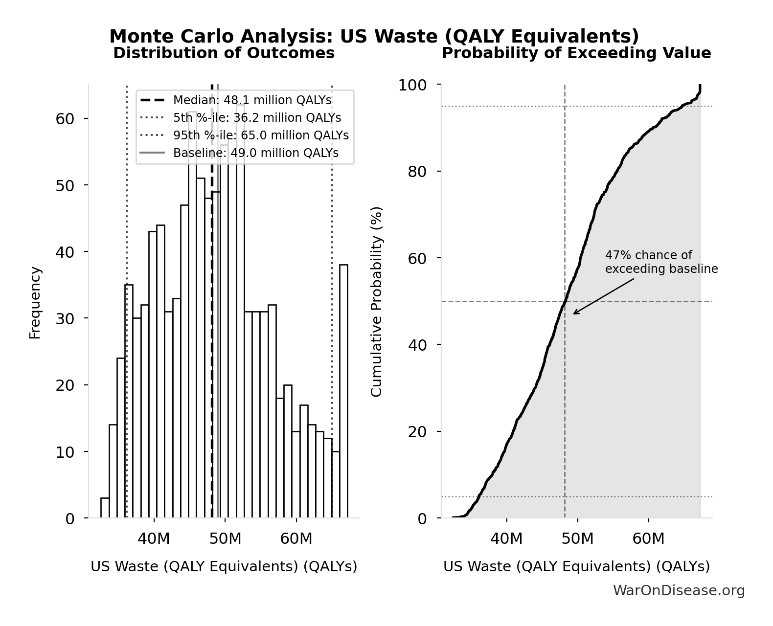 The histogram shows the distribution of US Waste (VSL Equivalents) across 10,000 Monte Carlo simulations. The CDF (right) shows the probability of the outcome exceeding any given value, which is useful for risk assessment.