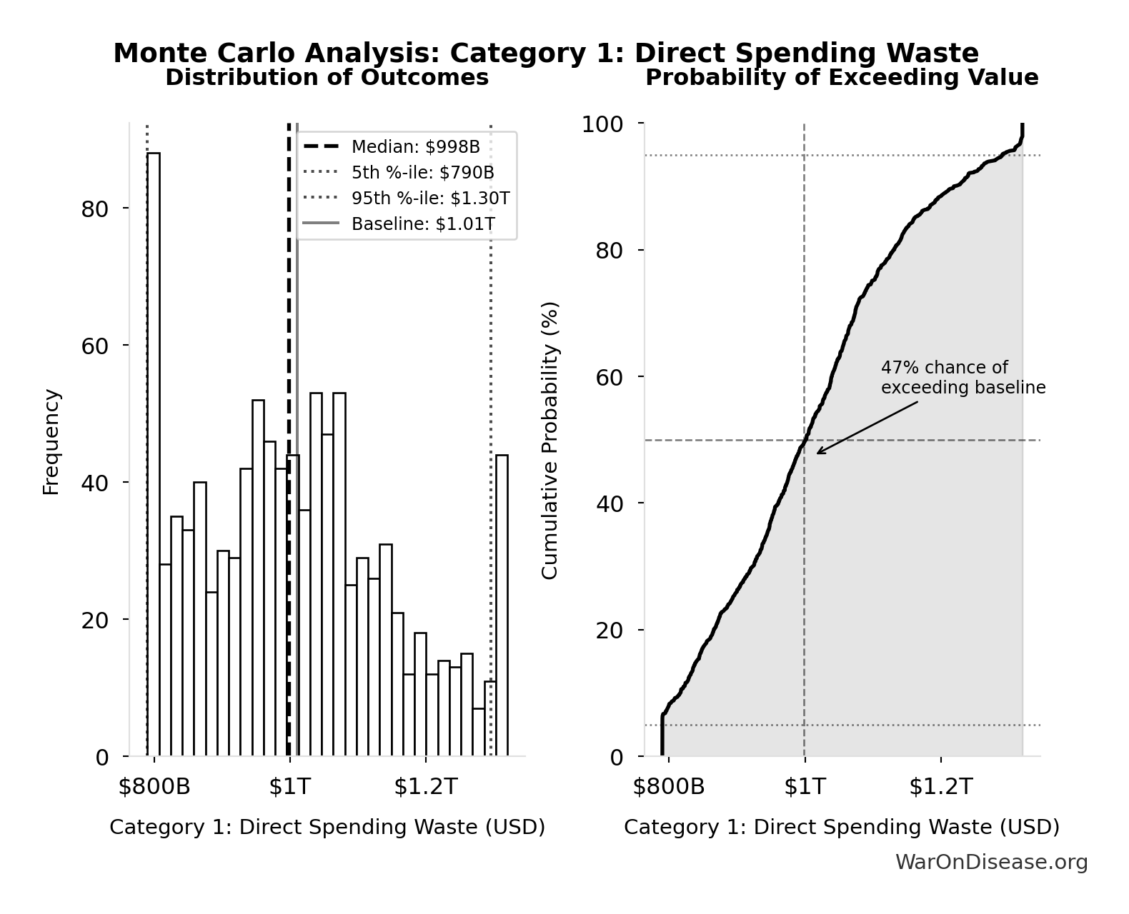The histogram shows the distribution of Category 1: Direct Spending Waste across 10,000 Monte Carlo simulations. The CDF (right) shows the probability of the outcome exceeding any given value, which is useful for risk assessment.