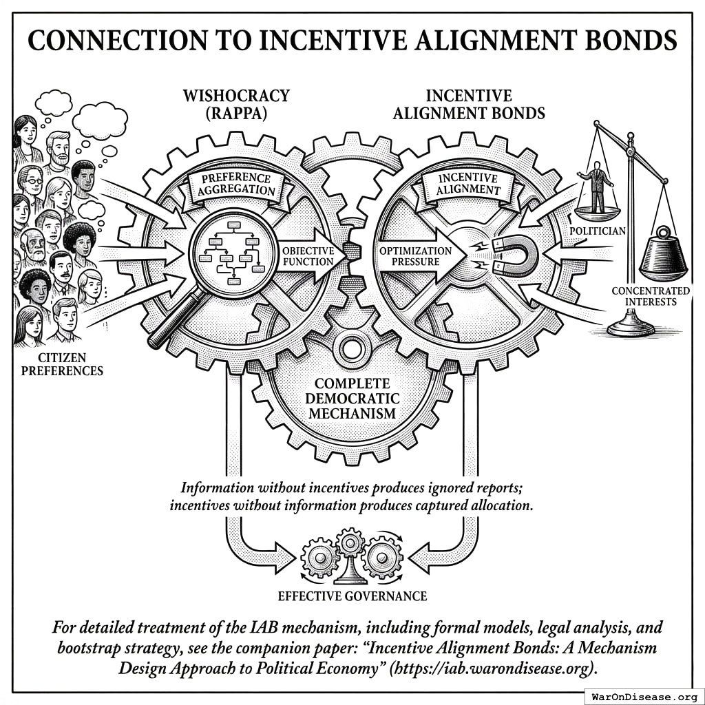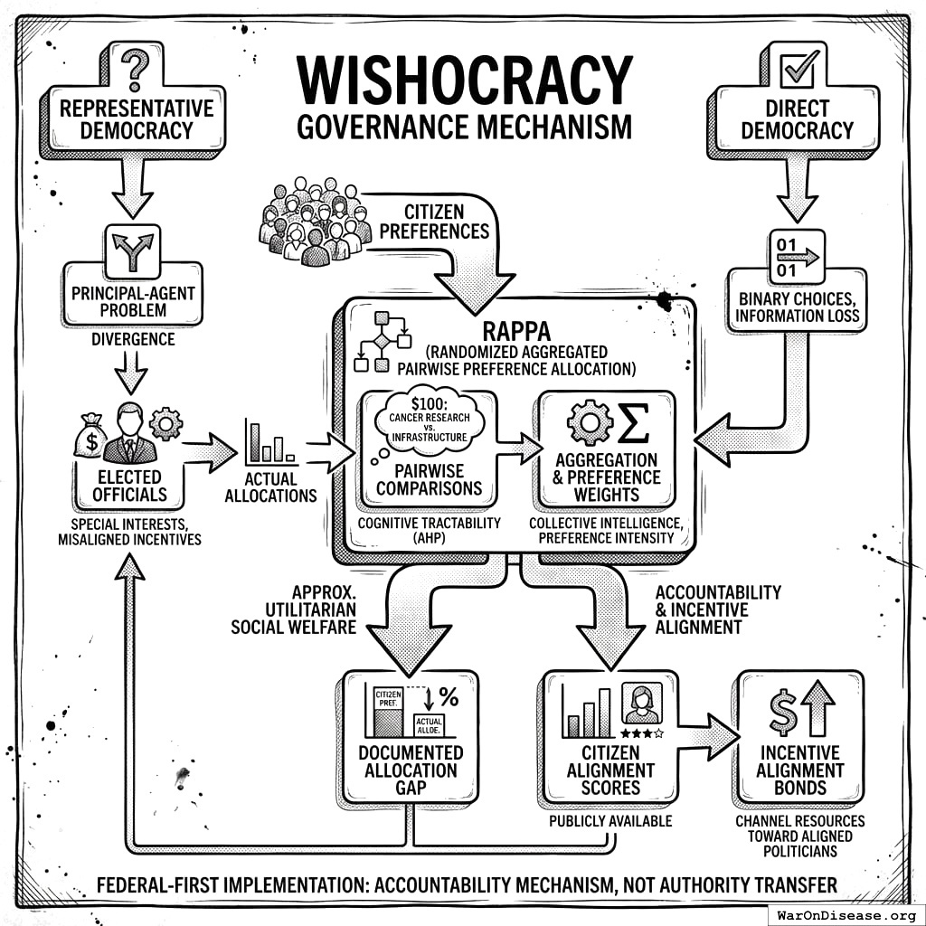 Representative democracy suffers from a fundamental principal-agent problem: elected officials systematically diverge from citizen preferences due to information asymmetry, special interest capture, and misaligned incentives. Meanwhile, direct democracy mechanisms reduce complex trade-offs to binary choices, losing crucial information about preference intensity. This paper introduces Wishocracy, a governance mechanism that addresses the democratic principal-agent problem by aggregating citizen preferences and creating accountability for elected representatives. The mechanism employs Randomized Aggregated Pairwise Preference Allocation (RAPPA), which presents participants with simple pairwise comparisons (‘allocate $100 between cancer research and infrastructure’) and aggregates millions of such judgments into preference weights that approximate utilitarian social welfare. Building on the Analytic Hierarchy Process141 for cognitive tractability and collective intelligence research11 for aggregation, RAPPA decomposes n-dimensional preference spaces into tractable binary choices while preserving preference intensity information. We present formal mechanism properties, computational complexity analysis, and empirical precedents from Porto Alegre’s participatory budgeting, Taiwan’s vTaiwan platform, and Stanford’s voting research. Rather than replacing representative democracy at the municipal level, we propose a federal-first implementation: (1) documenting the gap between citizen preferences and actual federal allocations, (2) creating public “Citizen Alignment Scores” for elected officials, and (3) integrating with Incentive Alignment Bonds142 to channel electoral and financial resources toward politicians whose voting records align with aggregated citizen preferences. This approach treats Wishocracy as an accountability mechanism that makes representative democracy work better, requiring no authority transfer, only information provision and incentive alignment.