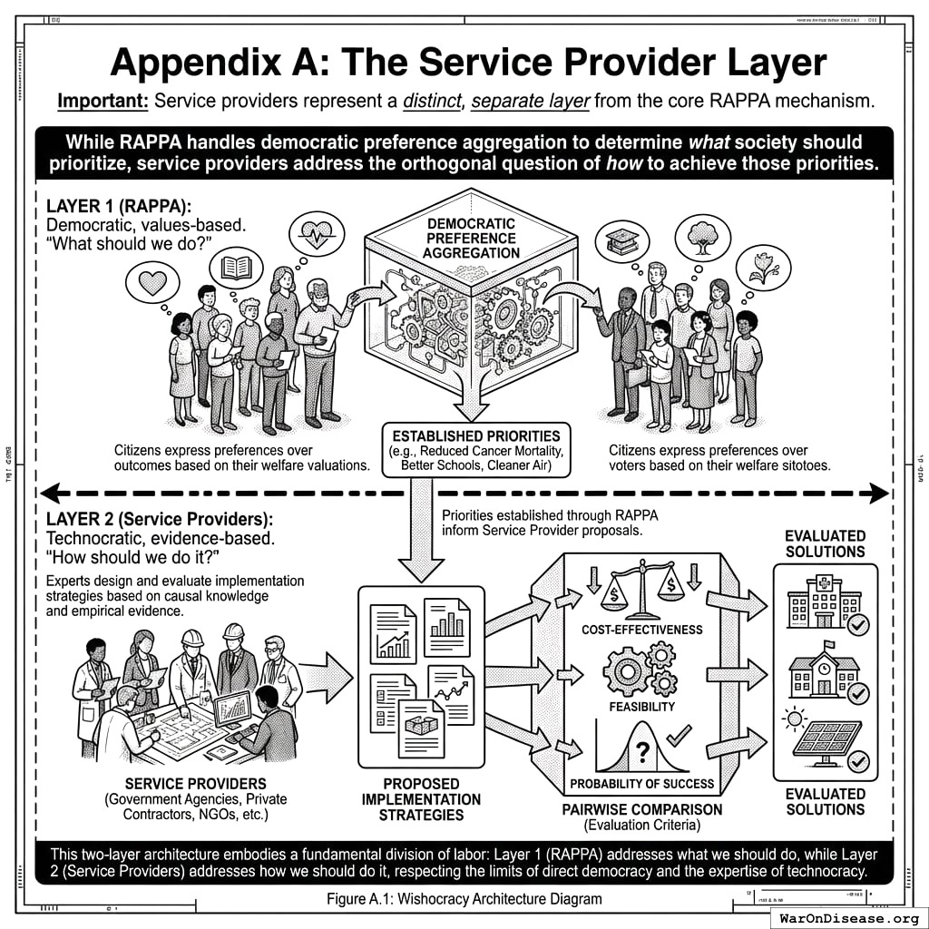 Wishocracy implies a separation of concerns: RAPPA determines what society values (the priority vector \(\mathbf{w}\)), while the implementation of those priorities is handled by a separate layer of competitive problem-solving organizations (see Appendix A: The Solution Layer). This distinction prevents the mechanism from bogging down in technical debates during the preference aggregation phase.
