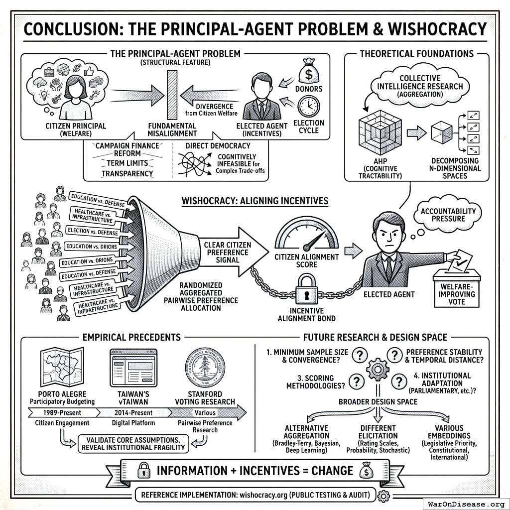 Scale note. If that accountability layer works at system scale, the upside is civilization-scale rather than procedural. Under the project’s best-case governance ceiling, the recoverable upside is $101T (95% CI: $83.3T-$191T) per year. Over 20 years, the Wishonian Optimal Governance Trajectory reaches 56.7x (95% CI: 19.3x-304x) the Earth baseline, raises average income to $1.16M (95% CI: $395K-$6.22M) versus $20.5K on the status-quo path, and reaches $10.7 quadrillion (95% CI: $3.64 quadrillion-$57.2 quadrillion) in total output. This paper focuses on the citizen-preference and accountability layer of that plan; the full derivation lives in The Political Dysfunction Tax48.