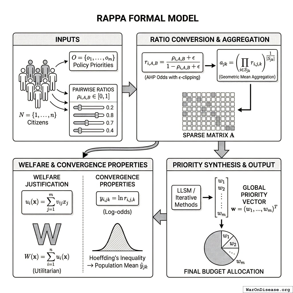 Cognitive Tractability: By decomposing n-dimensional budget allocation into pairwise comparisons (drawing on AHP), RAPPA respects the well-documented cognitive limit of \(7 \pm 2\) simultaneous comparisons, making participation feasible for all citizens regardless of education or available time.