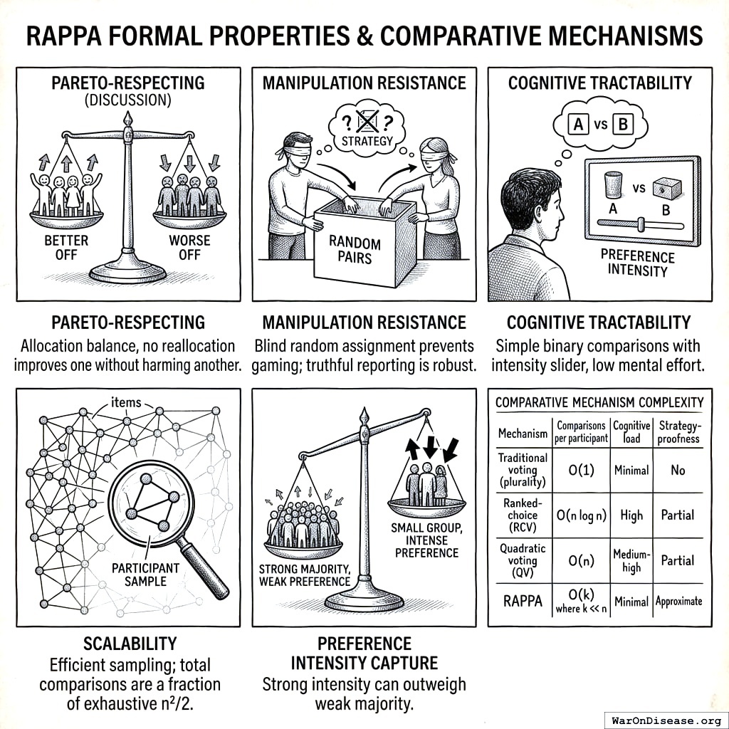 Comparative Advantages: RAPPA’s unique contribution lies in simultaneously addressing three constraints that limit alternative mechanisms: (1) Cognitive tractability through pairwise decomposition, (2) Preference intensity capture through slider-based allocation, and (3) Scalable aggregation through eigenvector methods that synthesize sparse distributed inputs. Where liquid democracy addresses who decides, futarchy addresses how to predict outcomes, and conviction voting addresses temporal aggregation, RAPPA addresses how to elicit preferences over complex multidimensional spaces.