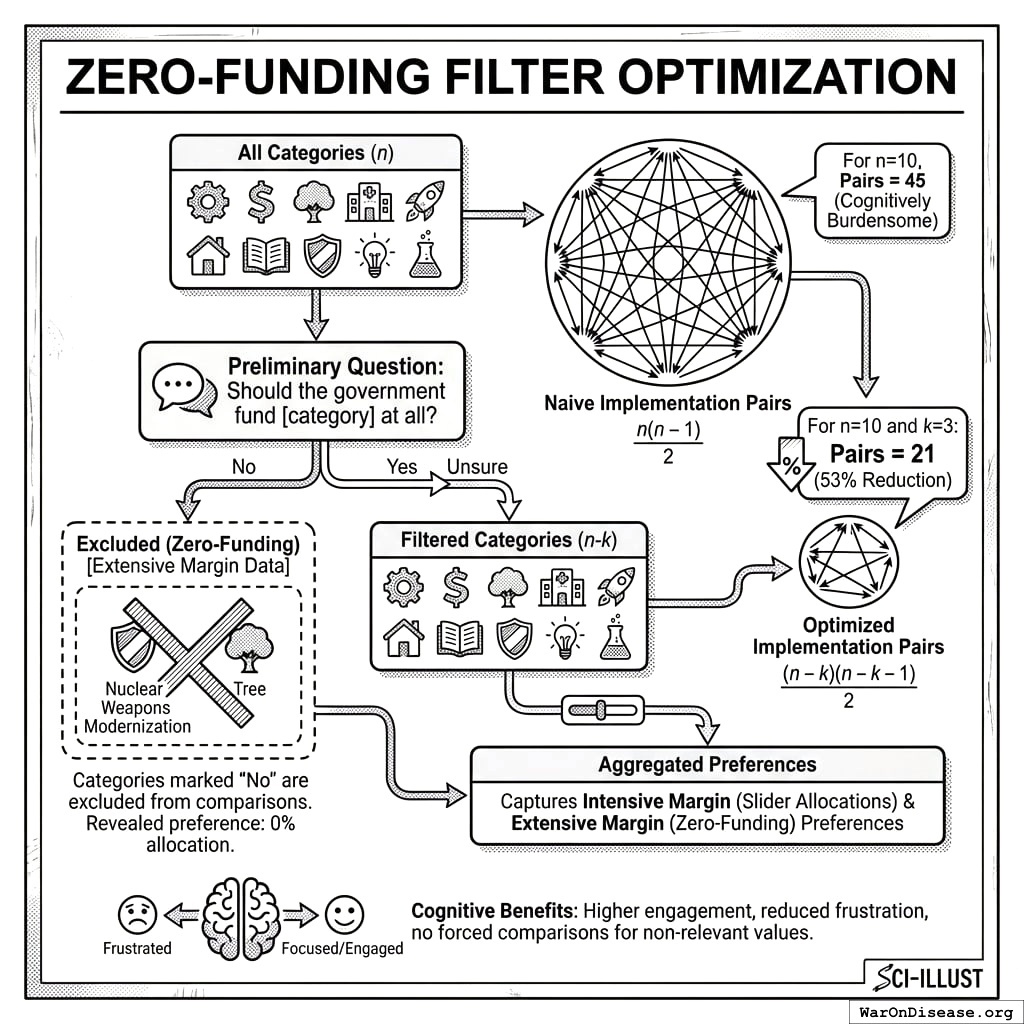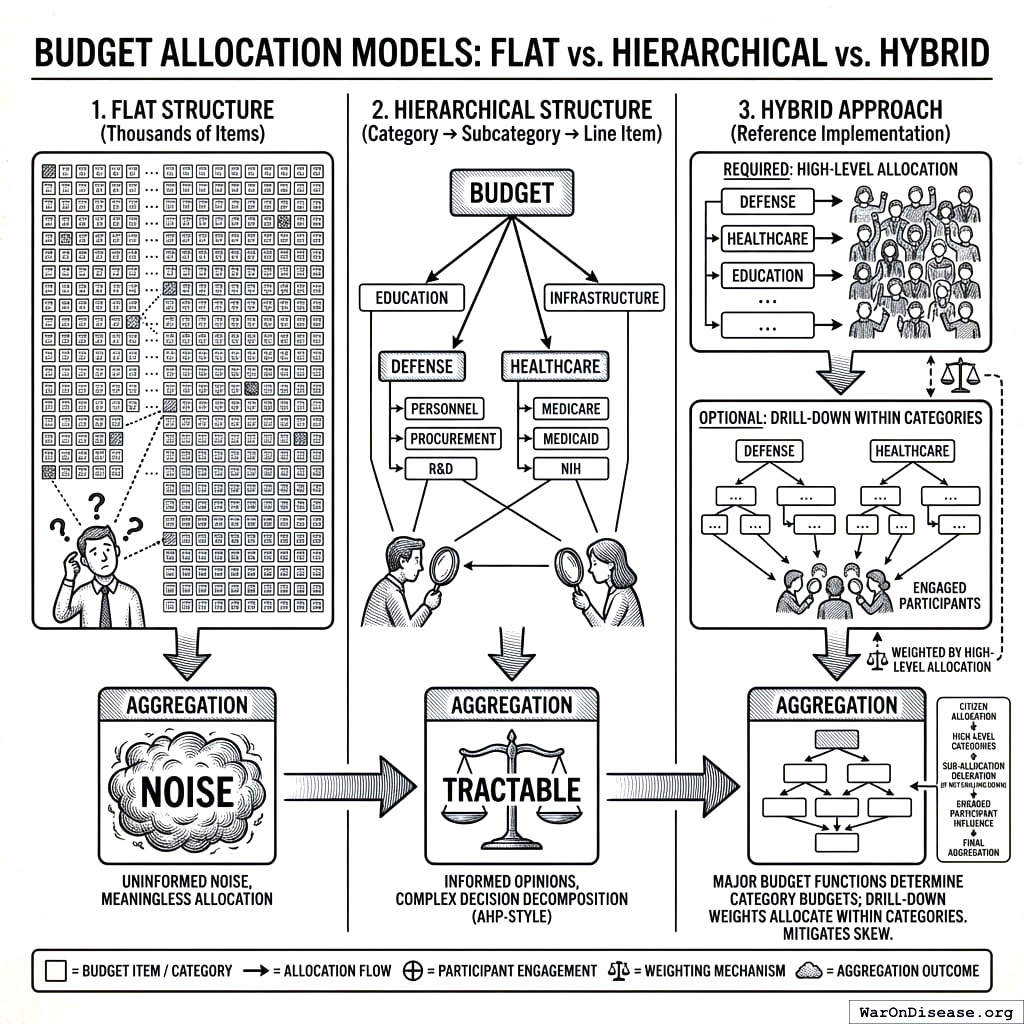 - Aggregation: Millions of other citizens make similar pairwise comparisons. Alice never sees “Medical Research vs. Drug Enforcement,” but the system infers the relationship (Medical Research > Military > Drug Enforcement) through the transitive network of all citizens’ choices.