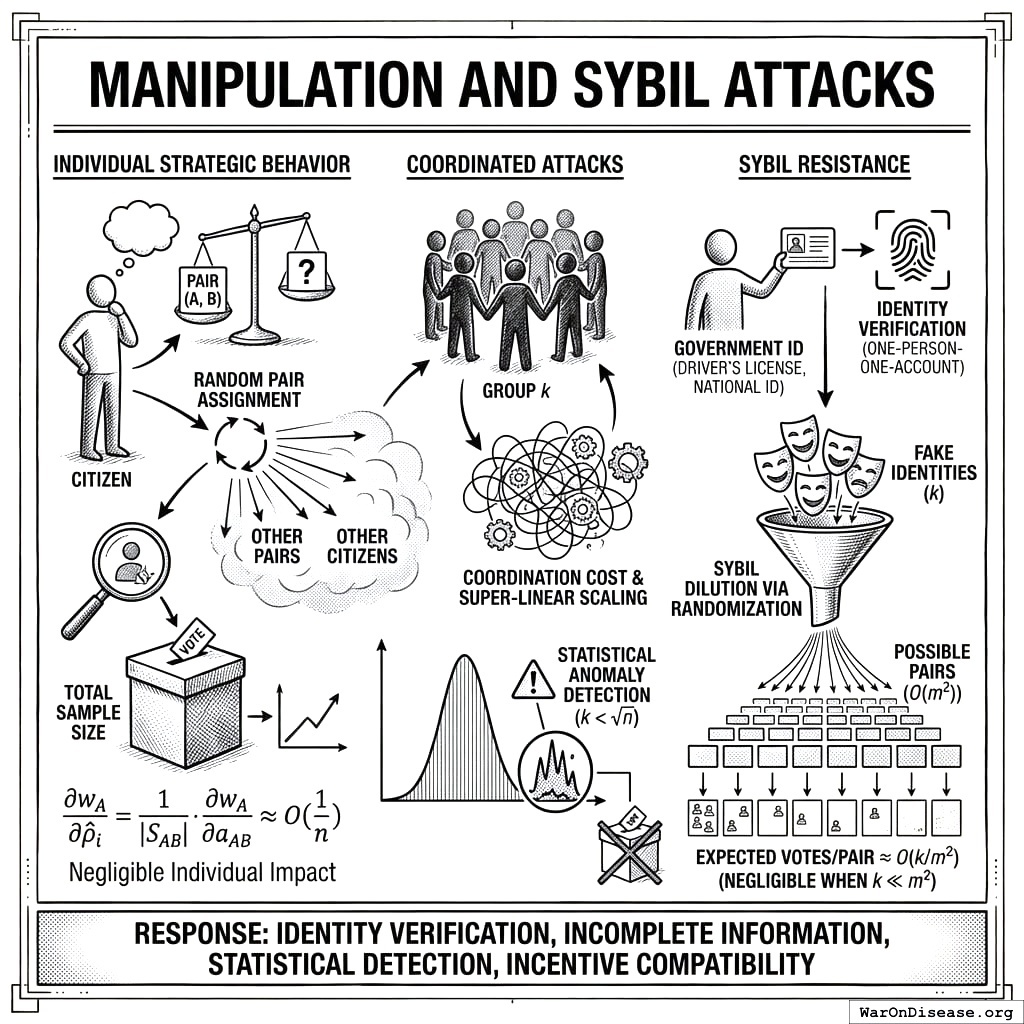 Empirical Performance: The reference implementation at wishocracy.org152 processes 10,000 comparisons across 50 items in under 100ms on standard cloud infrastructure (AWS t3.medium instance). Extrapolating linearly, national-scale deployment (1M participants, 100 items) would require ~10 seconds of aggregation time, negligible compared to voting/deliberation timescales measured in days or weeks.