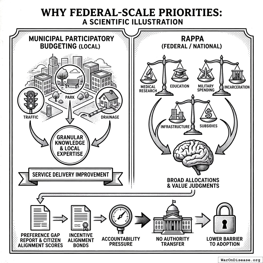 Participatory Budgeting: Traditional participatory budgeting (as pioneered in Porto Alegre146 and discussed in Section 4.1) involves citizen assemblies deliberating on budget proposals, followed by voting147. While highly democratic, this approach faces scalability limits: participation rates typically remain under 5%, and cognitive load increases exponentially with the number of budget items148. RAPPA retains participatory budgeting’s democratic legitimacy while achieving scalability through decomposition and statistical aggregation.