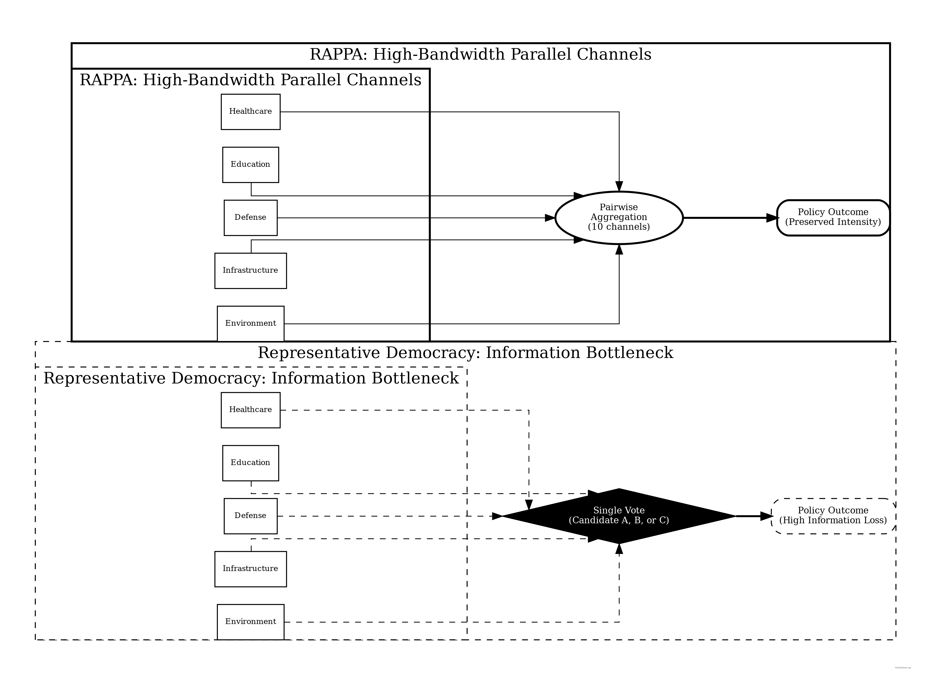Accountability Integration: By producing clear, quantifiable preference signals that can be compared against politician voting records, RAPPA enables accountability mechanisms (Citizen Alignment Scores, Incentive Alignment Bonds) that align representative behavior with citizen welfare.
