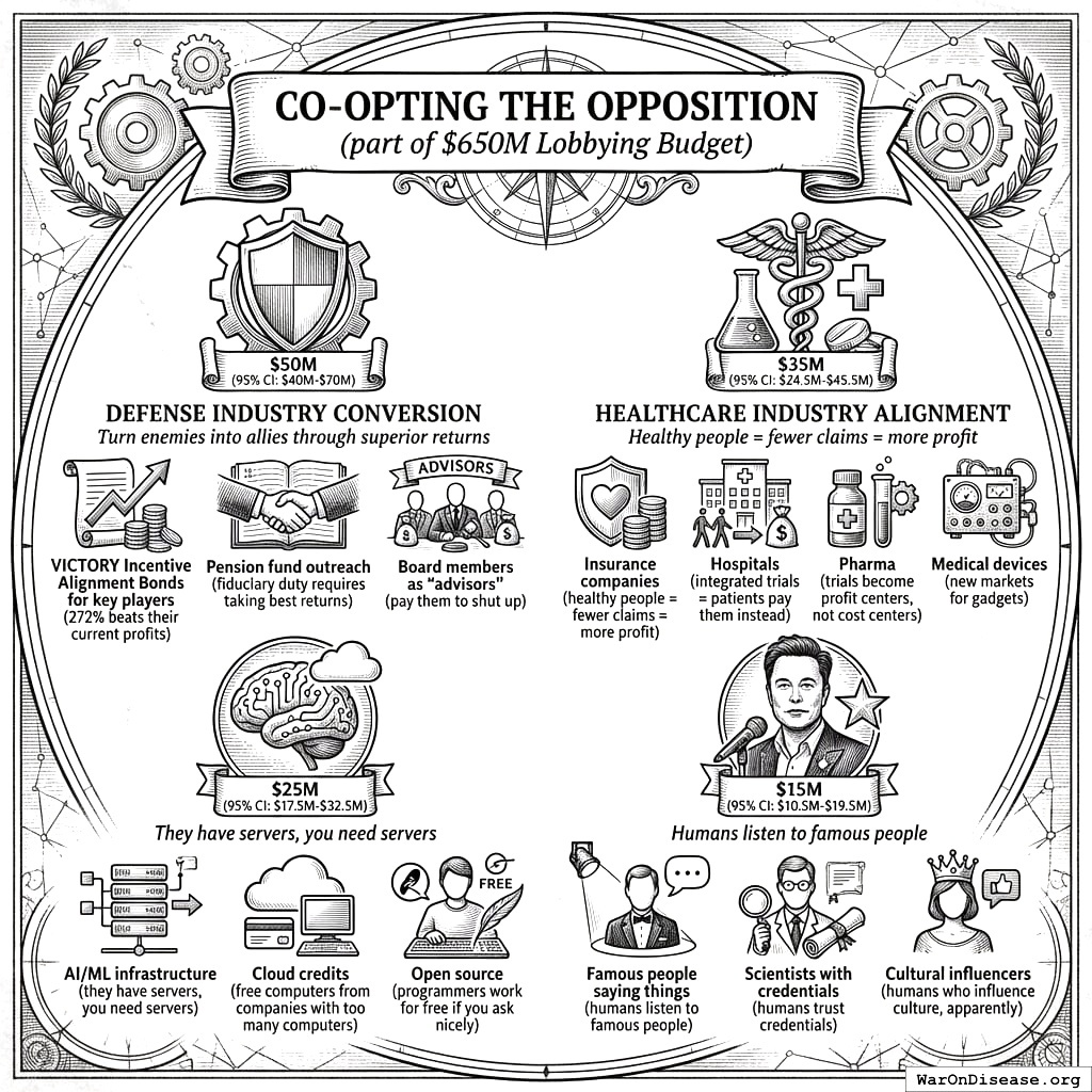 - Strategic lobbying: $50M (95% CI: $35M-$65M) (legally bribe only the humans who matter)