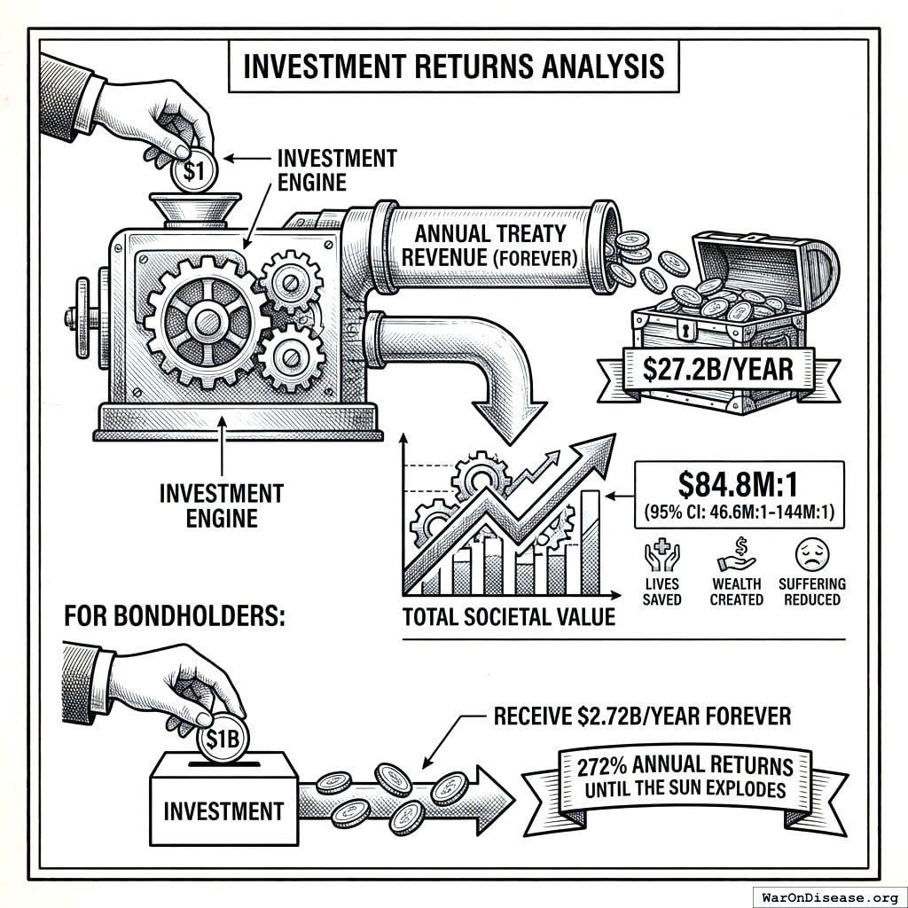 10.5281/zenodo.18161560 6.65 thousand diseases have zero FDA-approved treatments; at current trial capacity, exploring them takes 443 years. Redirecting 1% of military spending scales capacity 12.3x, cutting the timeline to 36 years and preventing 10.7 billion deaths. At $0.00177/DALY, 50.3kx more cost-effective than the best existing interventions. Incentive Alignment Bonds make adoption politically viable.