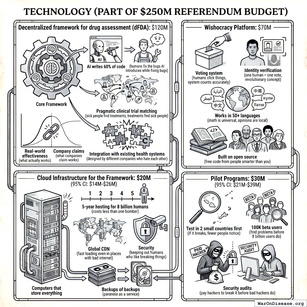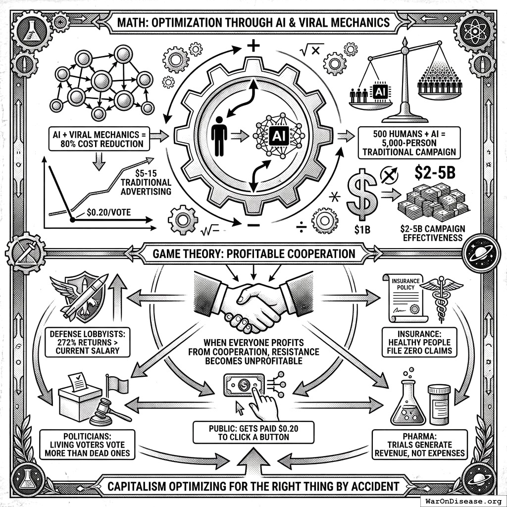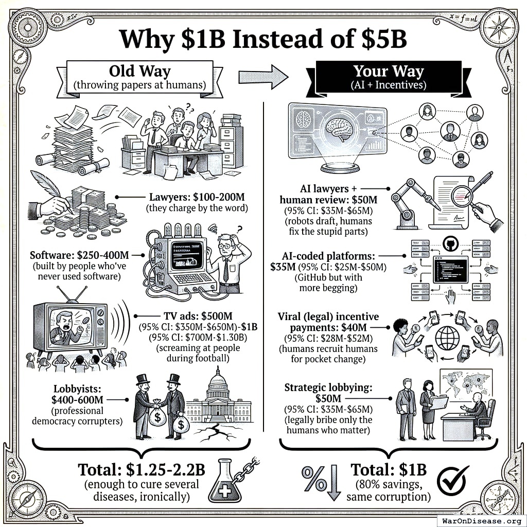 Your Execution Strategy: Budget for worst-case ($400M+). Execute with realistic assumptions. Optimize in real-time based on actual cost-per-vote data. Roll unused funds into higher referral payments, treaty implementation, or decentralized FDA146,147 development. Unlike your military, you don’t lose the savings in a couch cushion.