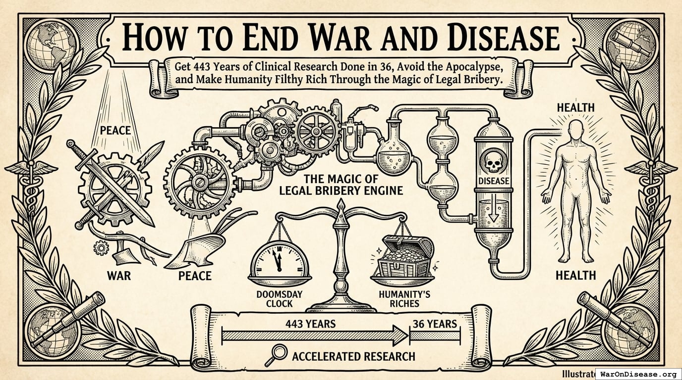 6.65 thousand diseases have 0 FDA-approved treatments. At current trial capacity (15 diseases/year), exploring the therapeutic search space takes ~443 years. Redirect 1% of military spending ($27.2B/year) to pragmatic clinical trials. Trial capacity jumps 12.3x. Search space explored in ~36 years instead of centuries. Average treatment reaches patients 212 years sooner. Timeline shift saves 10.7 billion deaths, valued at $84.8 quadrillion. Cost-effectiveness: $0.00177/DALY, 50.3kx better than bed nets. Even at 1% probability of treaty adoption, risk-adjusted cost-effectiveness remains superior to the best existing global health interventions. Incentive Alignment Bonds address political feasibility by tying legislators’ career incentives to a public voting scorecard. For ceiling context, the Minimum Sustainable Trajectory (1% Treaty) reaches 16.5x the Earth baseline after 20 years, with average income at $339K and total output at $3.11 quadrillion. The Optimal Governance Trajectory reaches 56.7x the Earth baseline, with average income at $1.16M versus $20.5K on the status-quo path and total output at $10.7 quadrillion (The Political Dysfunction Tax).