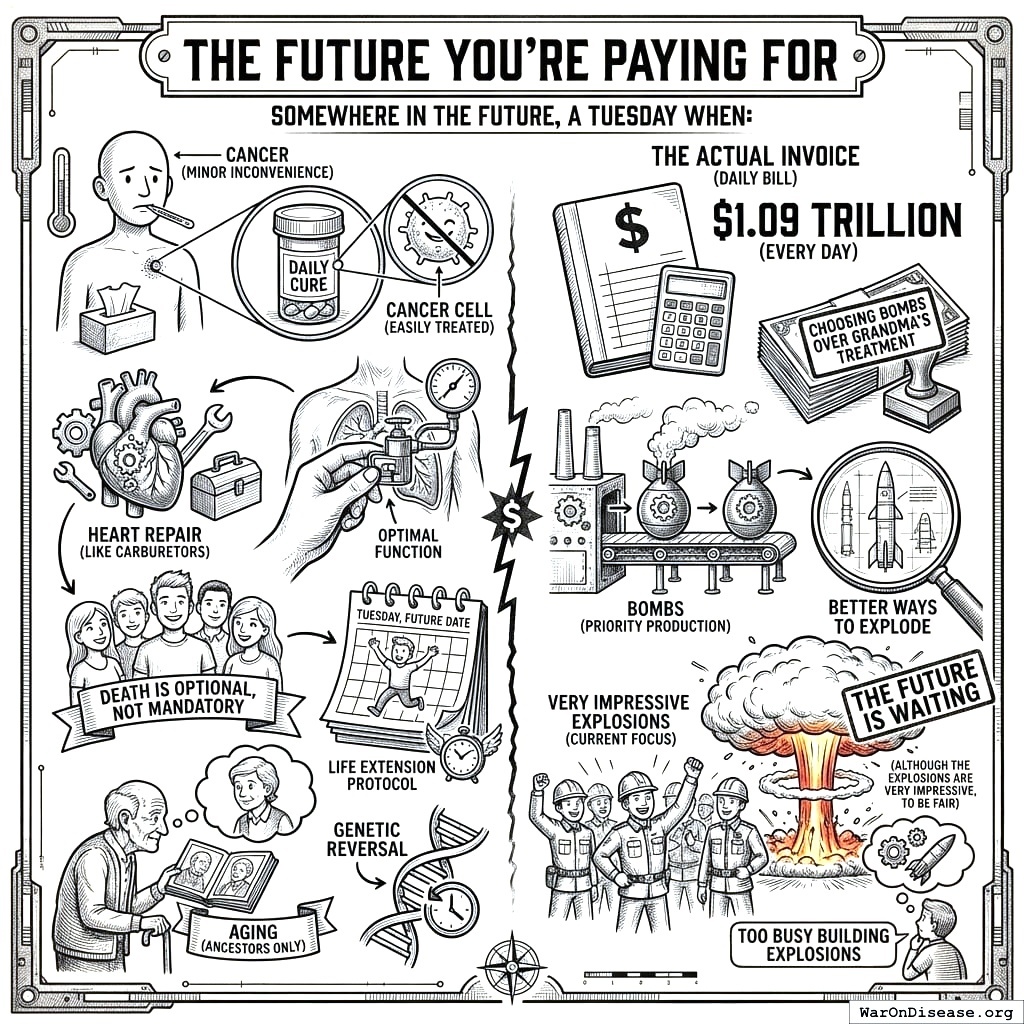 Humanity hemorrhages $397.4 trillion annually22 to diseases that are basically just engineering problems with meat robots.