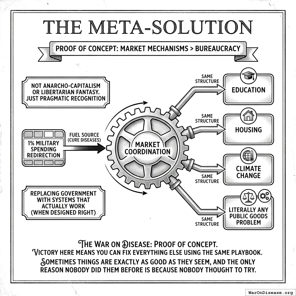 VICTORY Incentive Alignment Bonds are the papers that make this go. Investors get 10% returns. Politicians get 10% career incentives. Patients get 80% cures. Everyone gets what they want. Nobody has to stop being selfish.