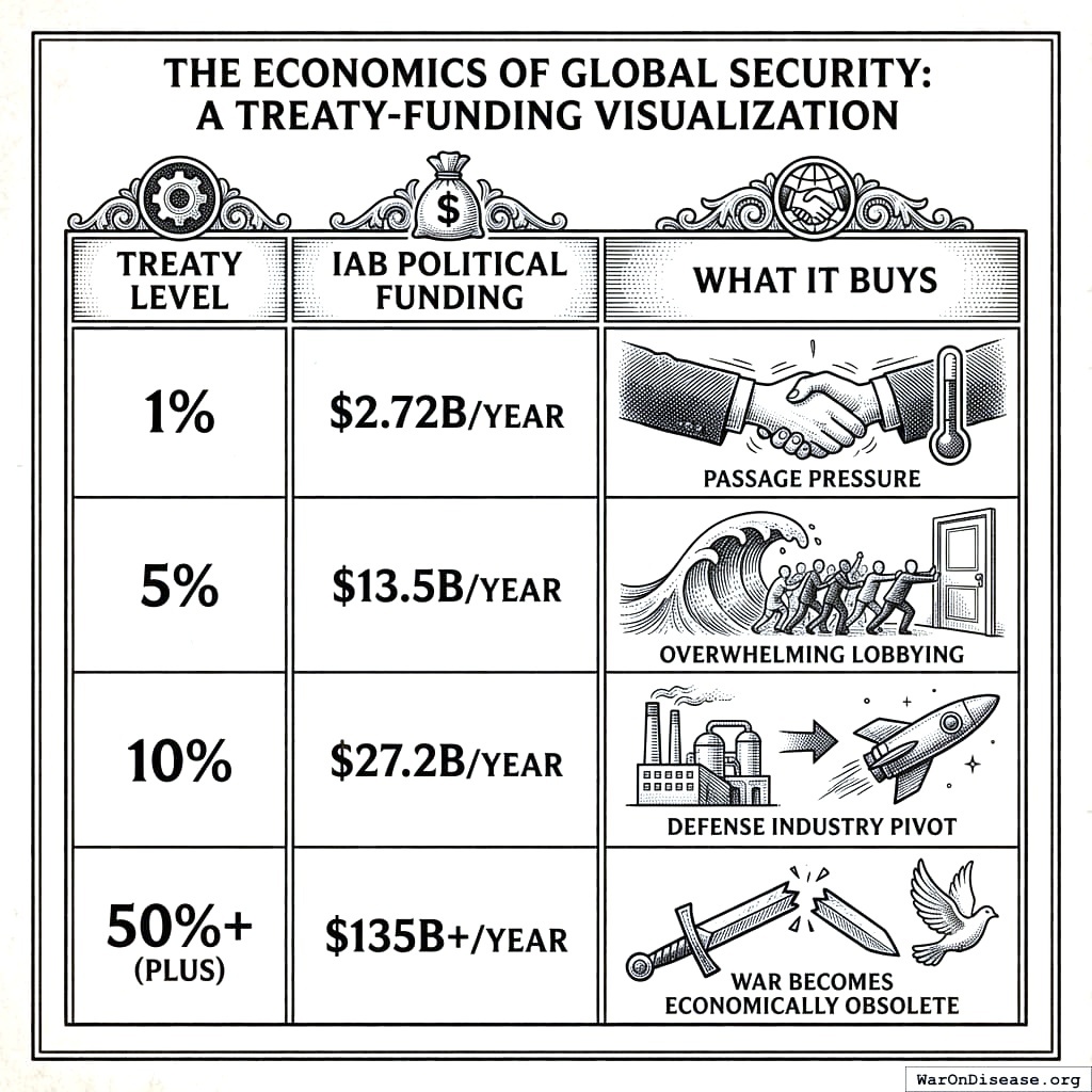 The 10% going to Incentive Alignment Bonds145 creates a machine that only goes one direction. When 1% passes, $2.72B/year flows to people whose entire financial interest is getting the treaty to 2%. When 2% passes, the pressure doubles. Each success makes the next one easier (and more profitable). This is a ratchet that can eventually redirect all military spending from war to health.